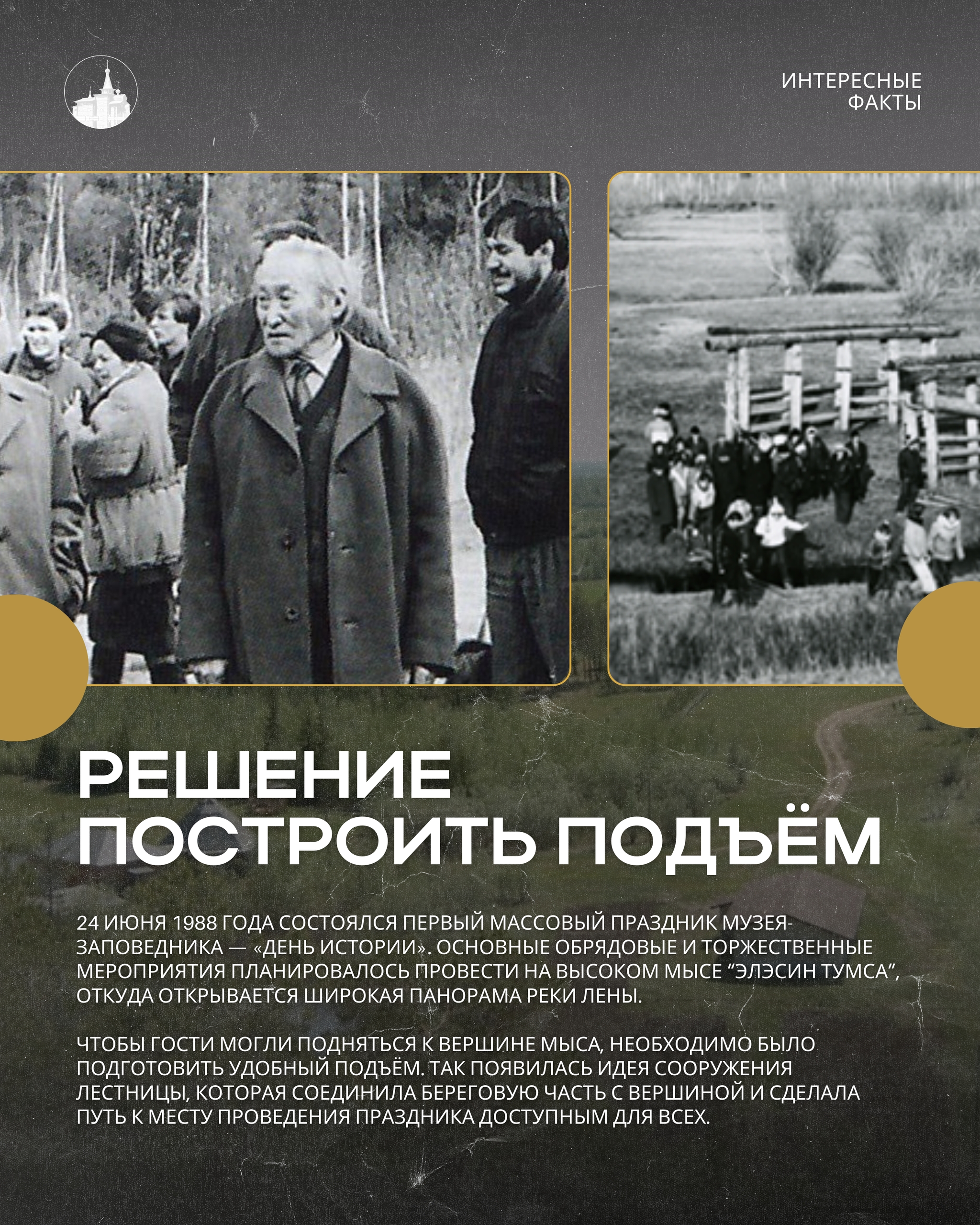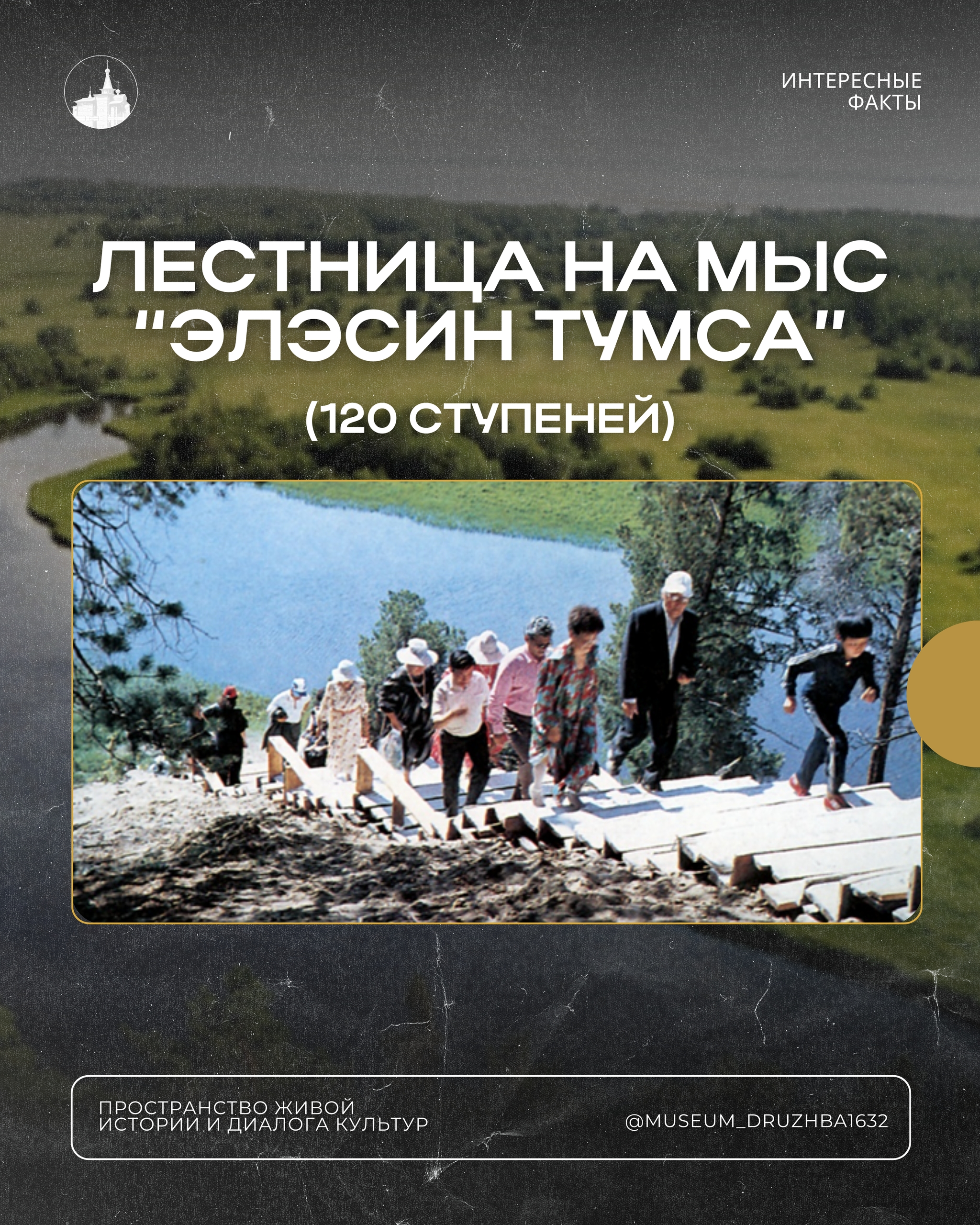 Её построили в 1988 году к первому массовому празднику комплекса — «Дню истории». Лестница из 120 ступеней соединила береговую часть с вершиной мыса, где должны были проходить основные обрядовые и торжественные мероприятия